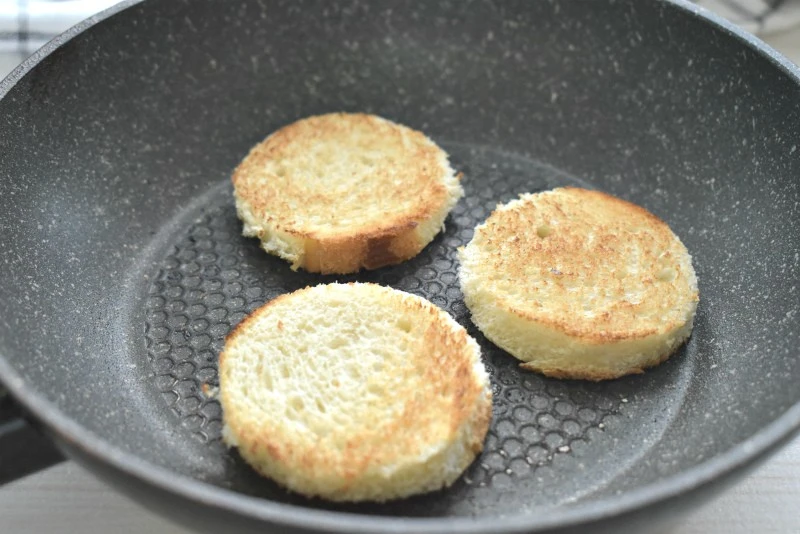Ломтики хлеба подсушиваем на сухой горячей сковороде с каждой стороны примерно по минуте.