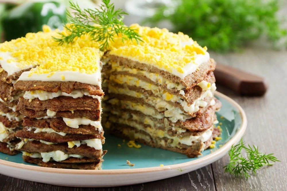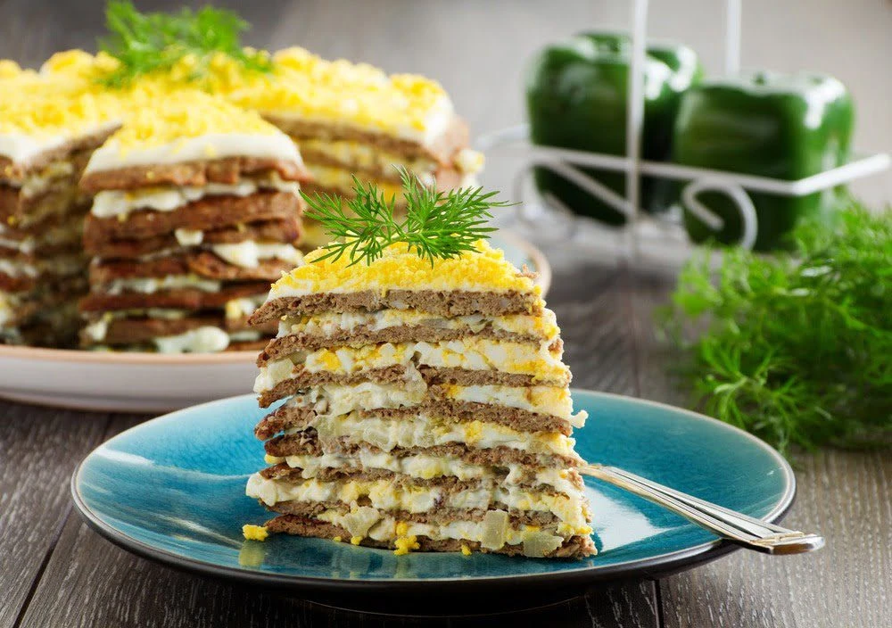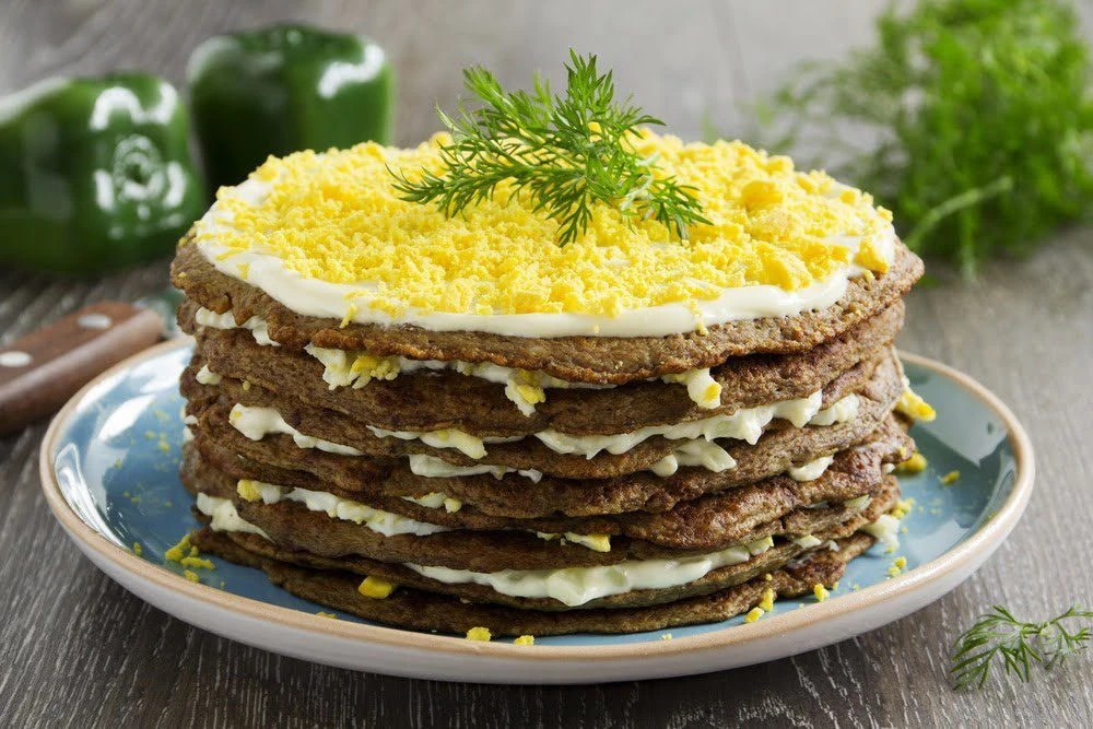 - Сверху распределяем лук, затем яйцо. Накрываем следующим печеночным коржом, опять промазываем майонезом и выкладываем начинку. Так поступаем со всеми коржами.