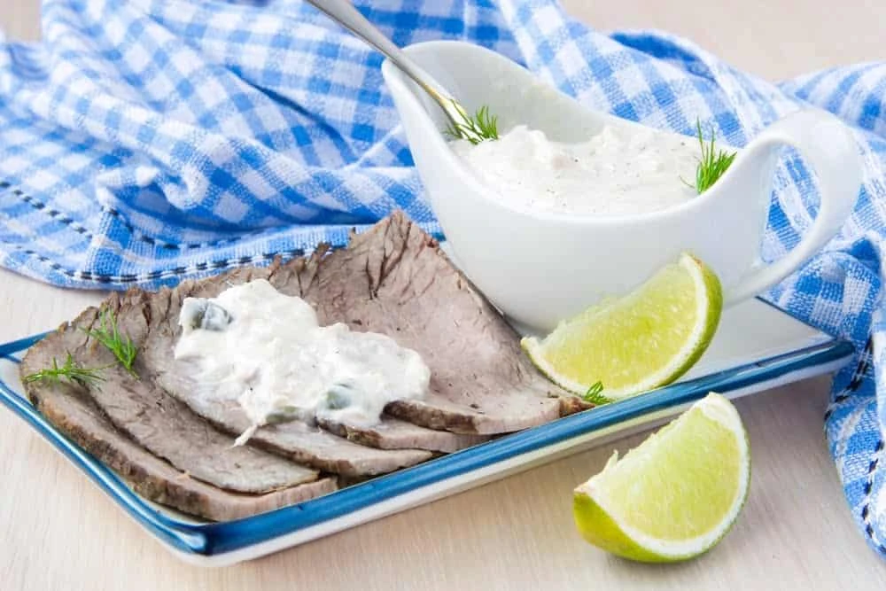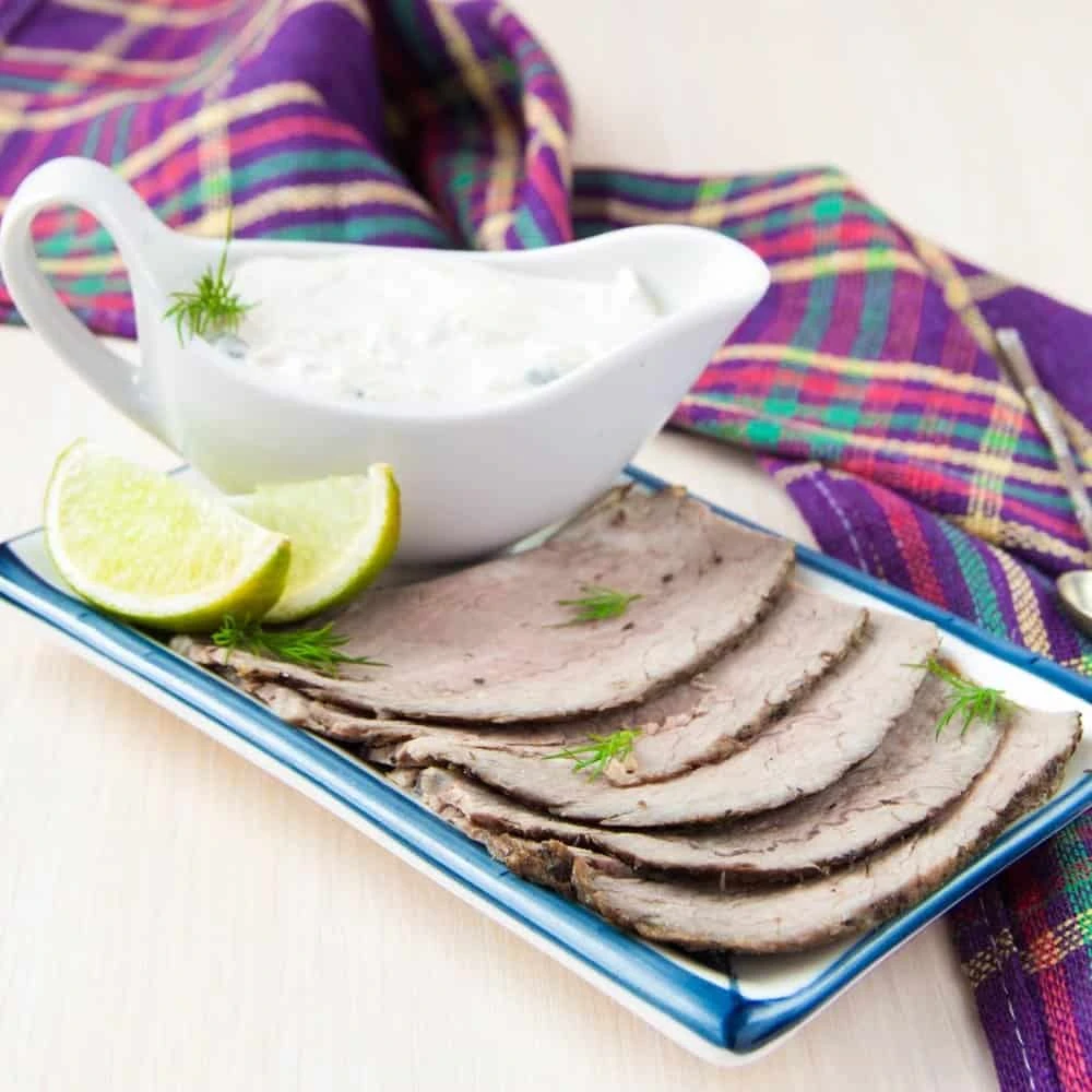 - После запекания мясо достать, остудить и освободить от фольги. Нарезать кусочками, украсить зеленью и подавать к столу с соусом.