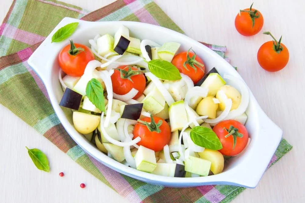 5. Нарезаем большими кусками сыр. Все подготовленные овощи выкладываем в форму для выпекания, предварительно смазанную оливковым маслом.