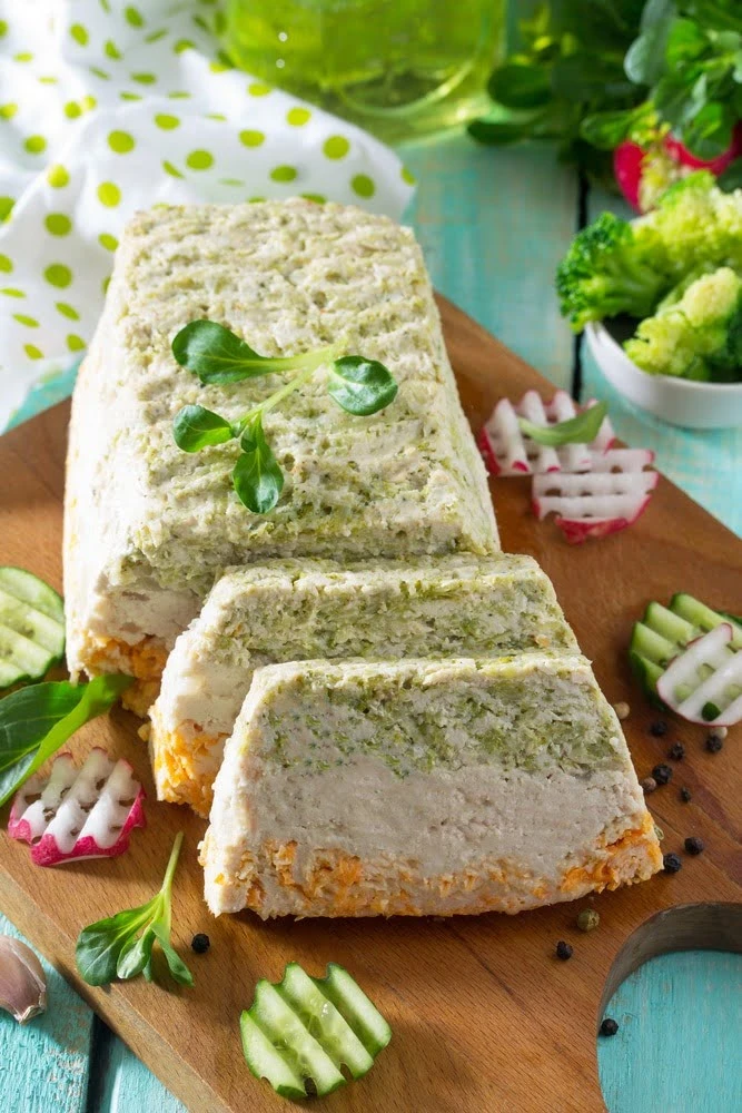 - Теперь возьмем форму для выпекания хлеба и выложим на ее дно первый слой – брокколи с фаршем. Вторым слоем мы сделаем луковый фарш, а третьим с морковкой. Очередность слоев не важна. Вы можете сделать по-другому.