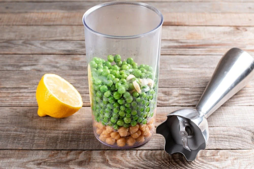 - Необходимо замочить нут на ночь (не меньше 6 часов). После чего отвариваем его 30-40 минут. Зеленый горошек варим до готовности. Перед готовкой хумуса, нут и зеленый горошек нужно охладить. Подготавливаем остальное: чистим и мелко нарезаем чеснок, давим лимонный сок. Все забрасываем в чашу блендера.